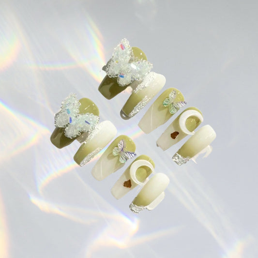 Green butterfly Press on Nails Short Fake Nails French Acrylic Full Cover False Nails for Women